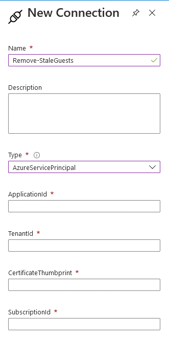 In the left pane, under shared resources select Connection. Push New Connection and from the drop down window select AzureServicePrincipal.